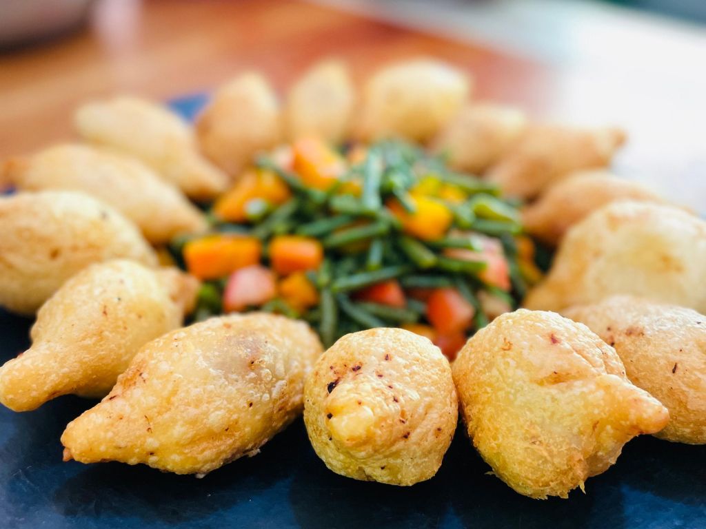 La masa fina y crujiente envuelve un relleno generoso — carne, papa, arroz, huevo — según la región, luego se sella en media luna y se sumerge en aceite bien caliente.
