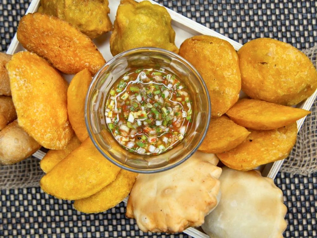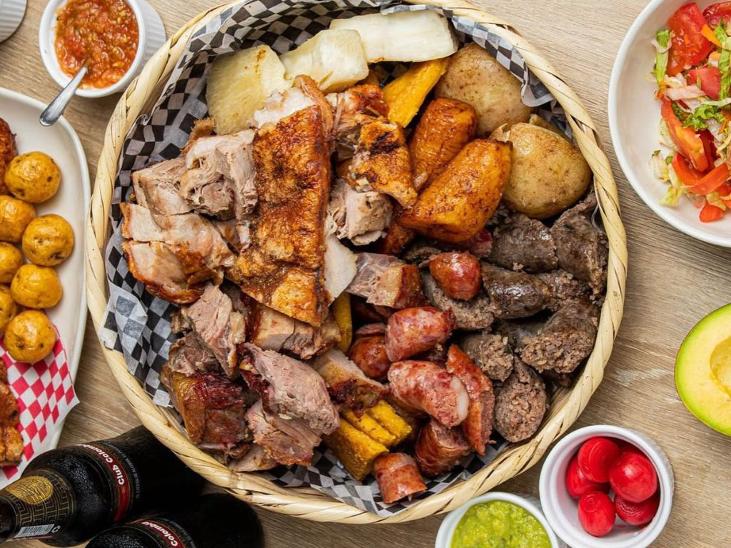 Todo acompañado de patacones, yuca frita, papa criolla (papa emblemática de la cocina colombiana) y arepas.
