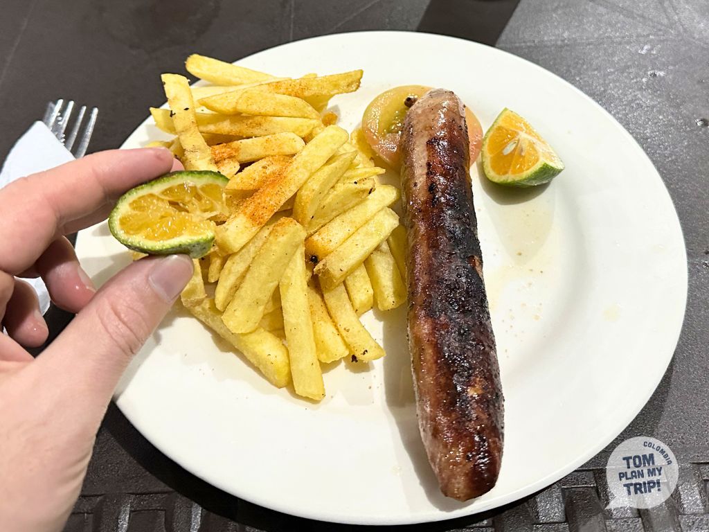 El chorizo santarrosano, es una salchicha de cerdo artesanal, finamente picada a mano, sazonada con cebolla, tomate, ajo, comino y especias — asada hasta estar bien dorada, luego servida con una papa criolla.