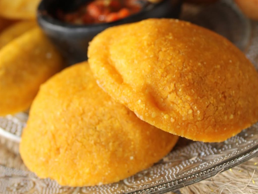 Una torta de maíz amarillo se fríe por primera vez, se abre por el lado para deslizar un huevo entero crudo — primera hazaña —, luego se cierra y se sumerge nuevamente en aceite hirviendo. La soldadura debe mantenerse absolutamente, de lo contrario, la arepa explota — segunda hazaña.