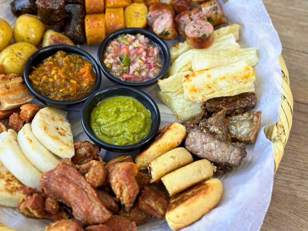 Un plato para compartir de la comida callejera colombiana.