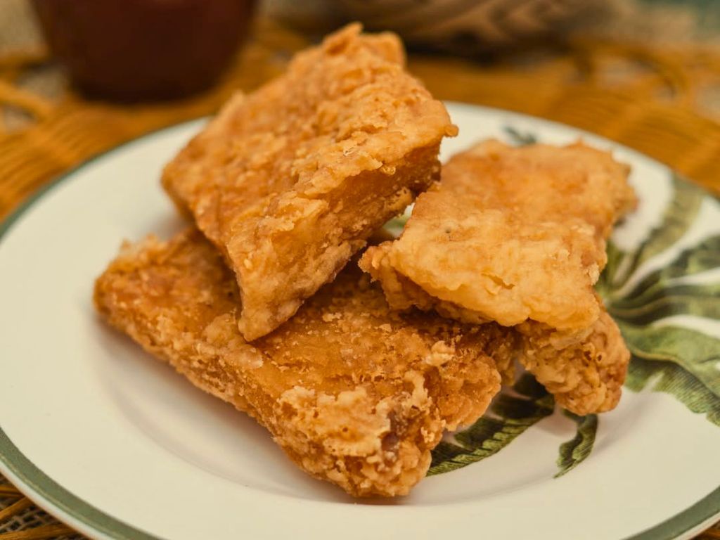 En su versión del Pacífico, es pescado o tollo ahumado (pequeño tiburón), envuelto en una masa de maíz fermentado y leche de coco, con hierbas aromáticas silvestres (cilantro, poleo y orégano), luego frito hasta estar bien dorado y crujiente — un bello equilibrio entre ahumado y yodado.