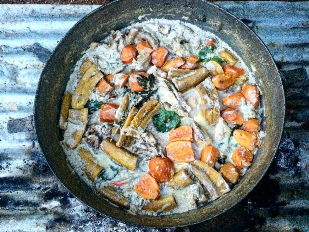 Todo se cocina lentamente en un gran caldero sobre un fuego de cáscaras de coco, luego se sirve por separado, rociado con caldo.