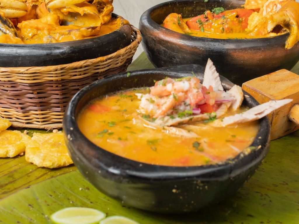 En el caldo cremoso con leche de coco, se cocinan camarones, calamares, almejas, langostinos y pescado fresco, sazonados con un sofrito: tomate, cebolla, ajo, pimentón y cilantro.